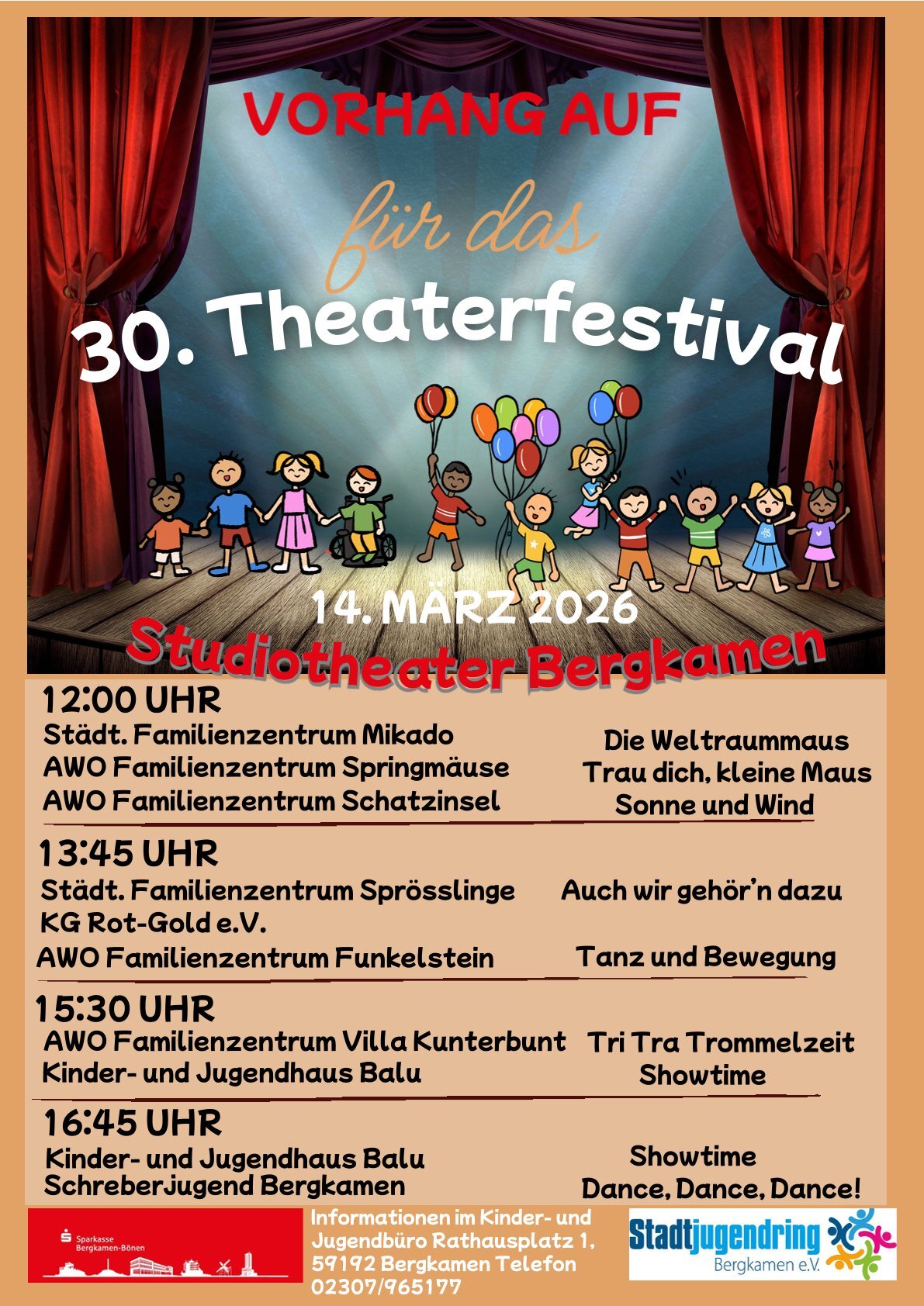 Am 14. März 2026 feiert das beliebte Theaterfestival des Stadtjugendringes Bergkamen e. V. ein bemerkenswertes Jubiläum: Bereits zum 30. Mal bringen Kinder und junge Künstlerinnen und Künstler aus den Bergkamener Kindertagesstätten, Schulen und Vereinen ein buntes, lebendiges Bühnenprogramm auf die große Festivalbühne.